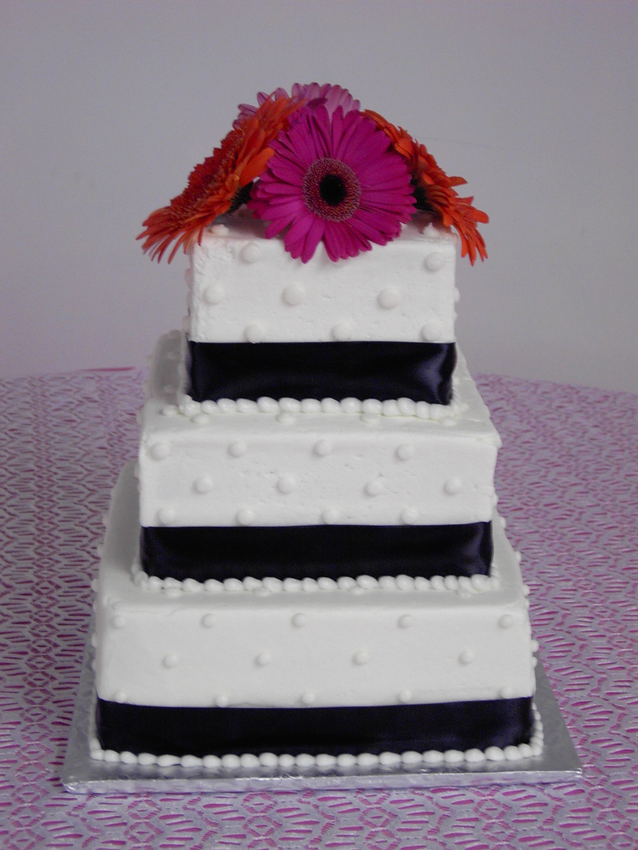 3-Tier Square Wedding cake with simple dot decor and black ribbon.