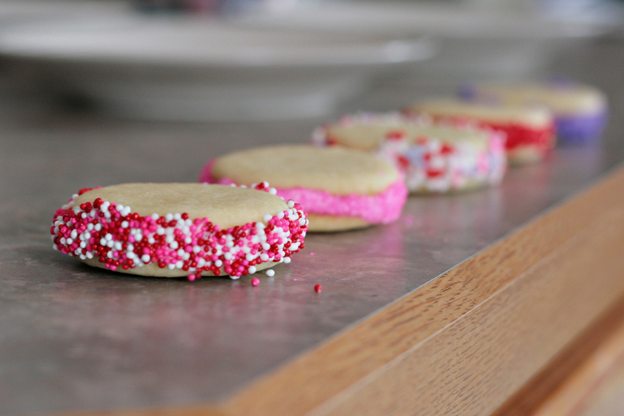 Bite size Sugar cookies cut out with the rim of a shot glass with BC sandwiched in between two cookies then rolled in sprinkles