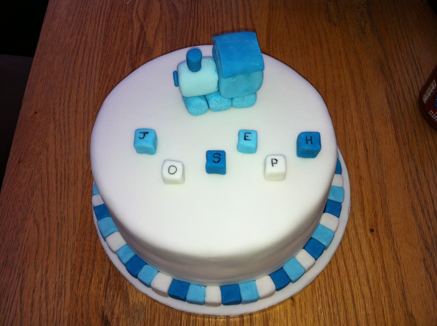 Vanilla Sponge cake covered in fondant with fondant train and blocks