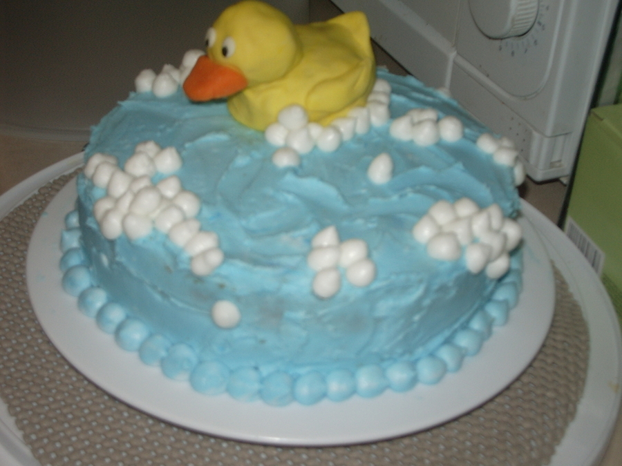 Bubble Bath cake for my son's first birthday. This is my first attempt at making my frosting look messy (to represent the water) . The cake is white with a cream cheese almond filling and covered in buttercream fabric. The duck is made of fondant.