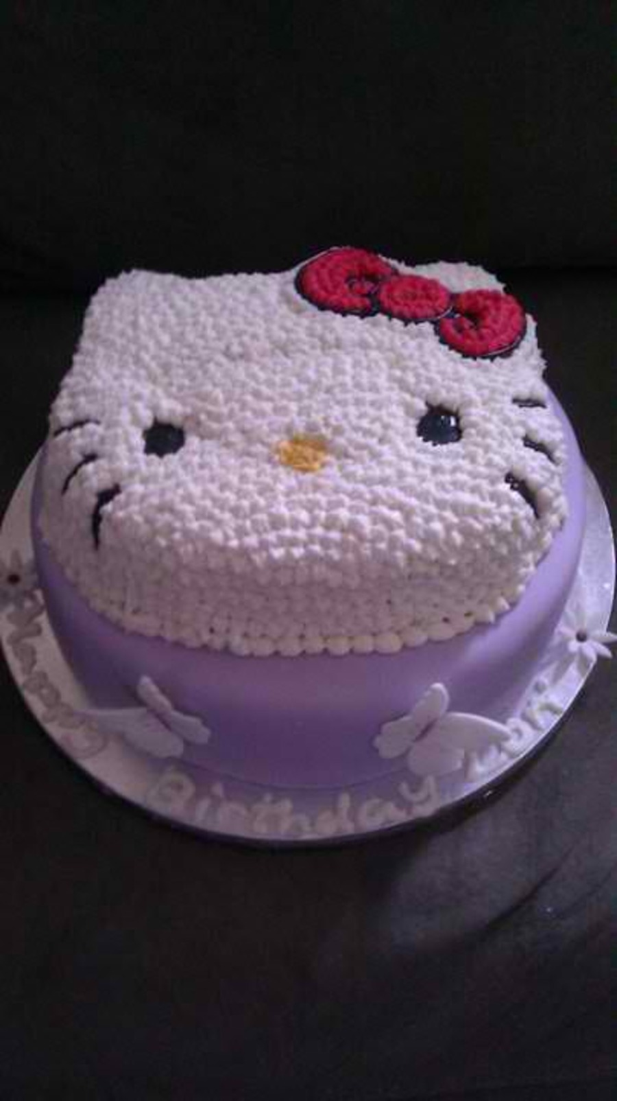 Hello Kitty cake for my niece's 4th birthday. Bottom is a white cake with white chocolate ganache and berries, top is a coconut cake with cream cheese frosting. She loved it!