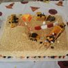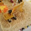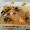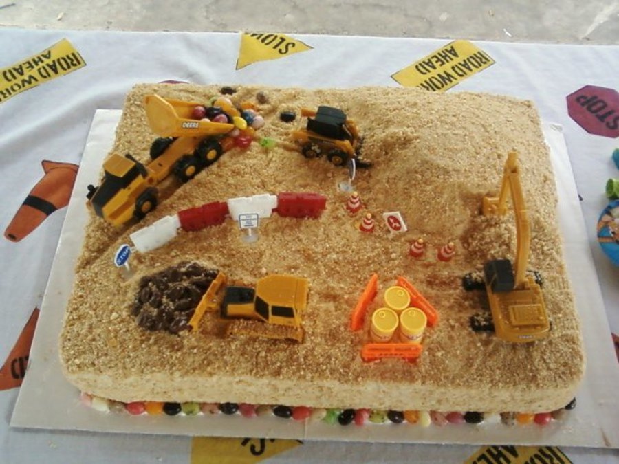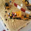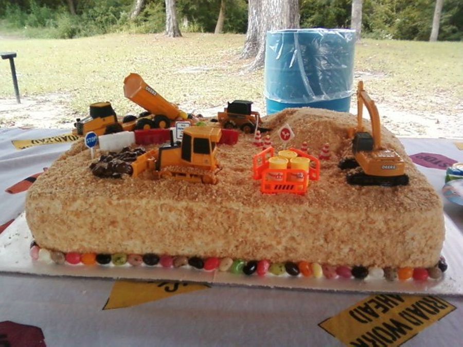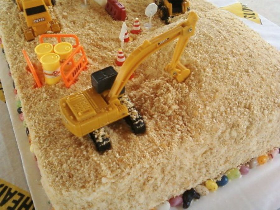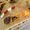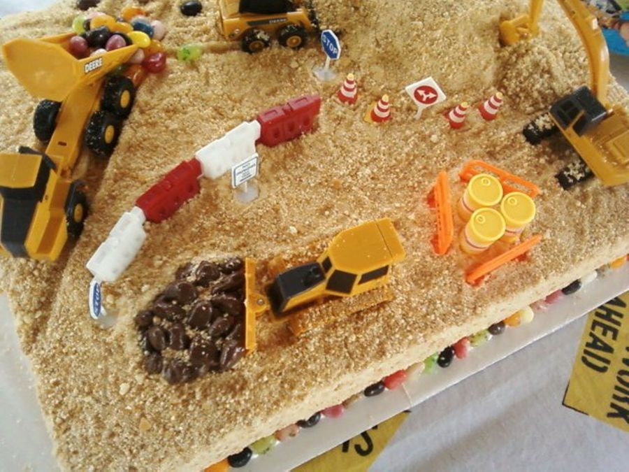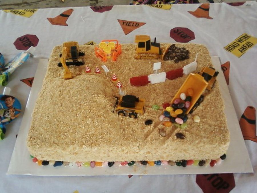 The "dirt hill" is cake. The cake is covered with crushed vanilla wafers...it adds a very yummy flavor as well as the dirt look. The "rocks" are jelly beans and raisinets. I "drove" the vehicles on the cake to make tire tracks.