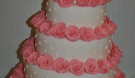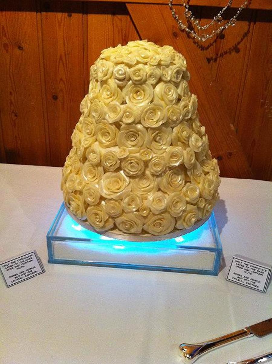 12", 10", 8" & 6" cake covered in Handmade chocloate Roses with edible diamond centres