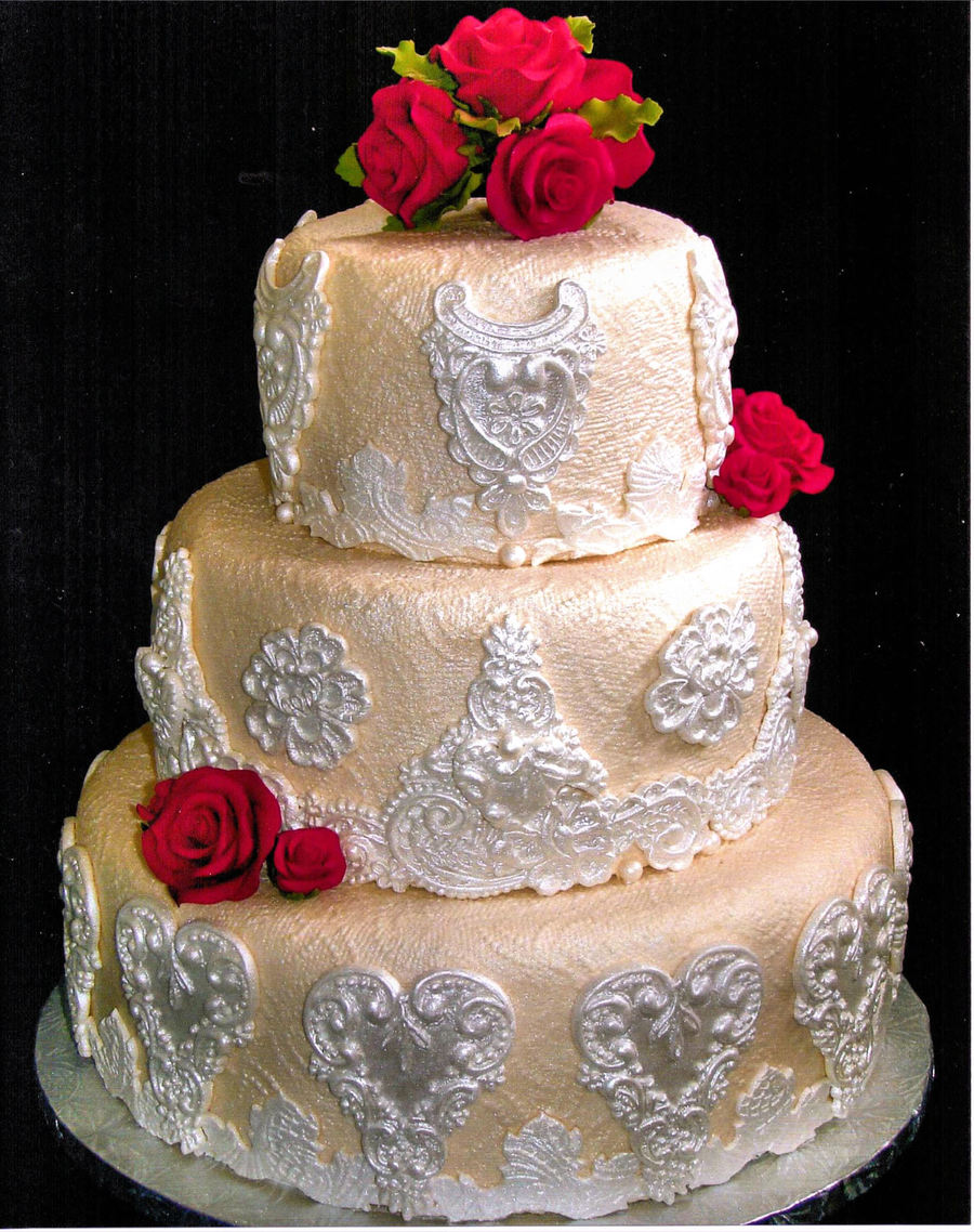 The tiers are covered with ivory textured buttercream. The fondant lace pieces are dusted with super pearl dust. Gumpaste red roses complete the design.