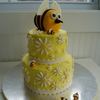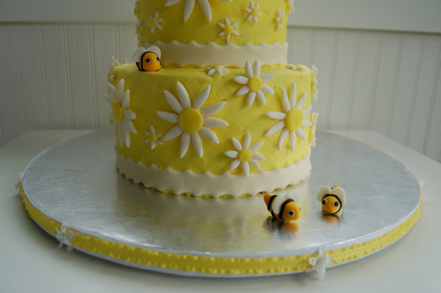 6" and 8" tiers WASC covered in buttercream with fondant accents. Bumble bee on top is cake baked in mini wondermold pan and covered in fondant. Bee's wings are white chocolate. Made for an 18th daisy themed birthday party.