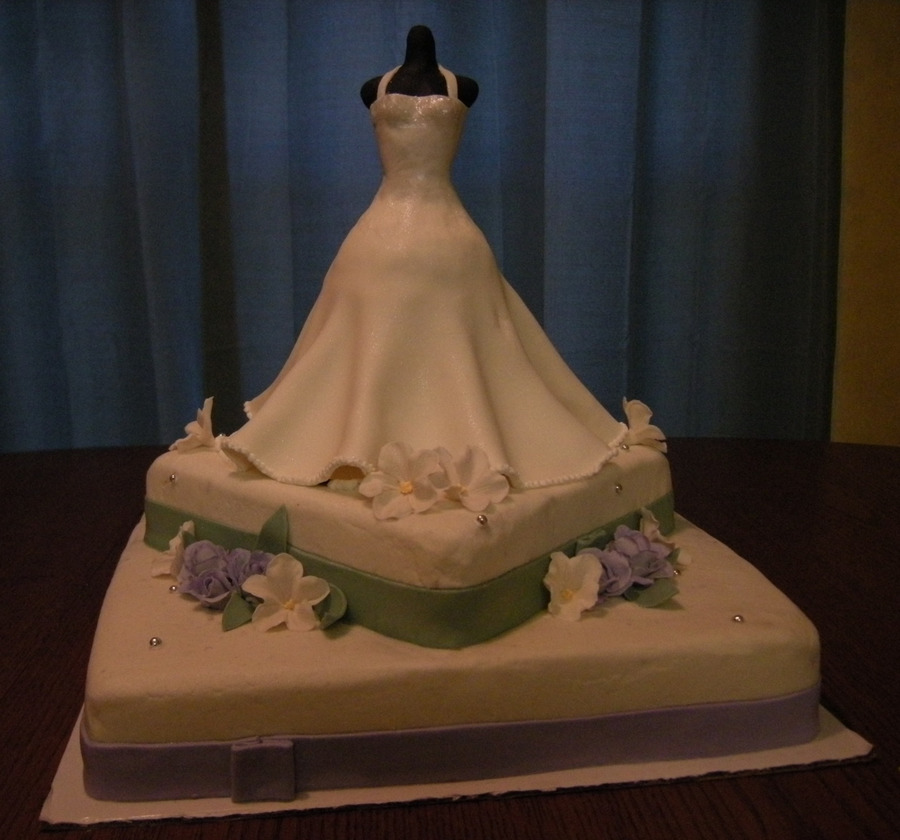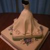 I made this cake for my sister's bridal shower. 8 inch and 12 inch buttercream iced cakes and dress is stacked 4 inch cakes and 1 mini half ball cake. Dress and manikin are fondant and buttercream. Gumpaste flowers and fondant ribbons. Luster dust and cake sparkles on dress.