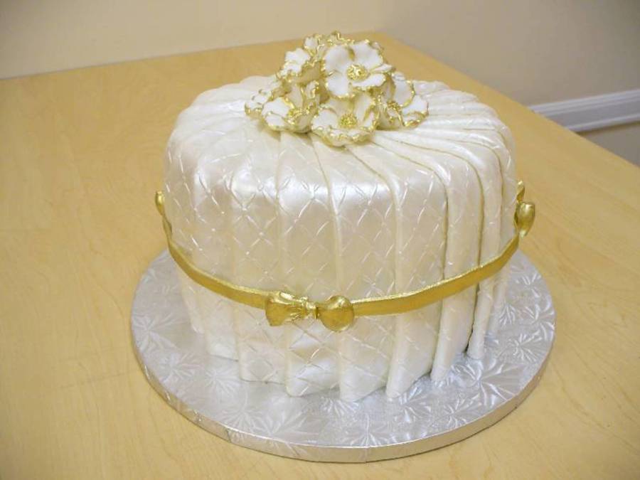 Pleated fondant, gold ribbon, silcone molds for roses, gilded in gold.