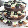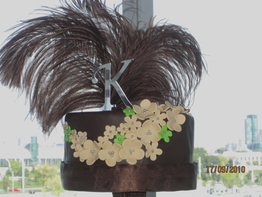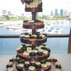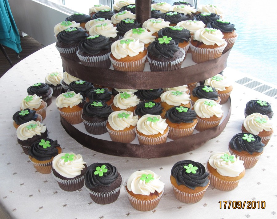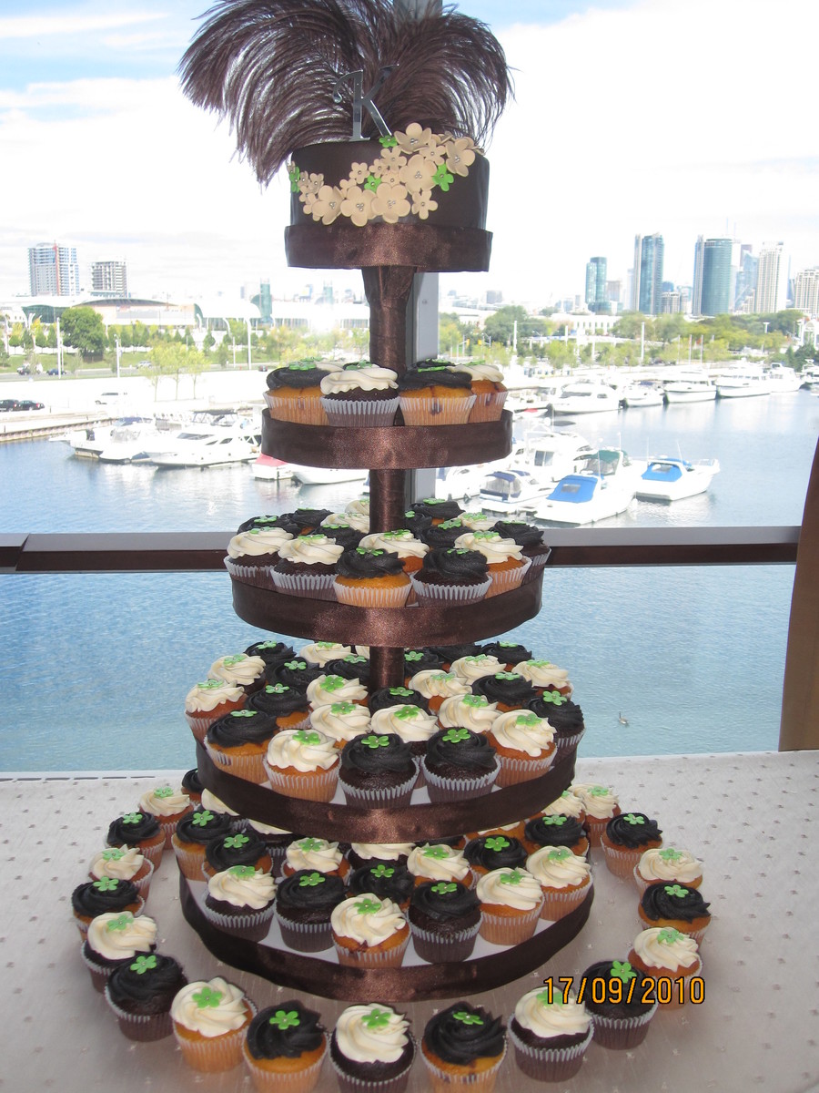 This was my 1st cupcake wedding tower :) The top tier is marble cake with MM fondant, fondant flowers, and feathers (bride's theme). The cupcakes are alternating chocolate and vanilla with chocolate and vanilla buttercream. I wrapped the stand with brown ribbon and I am very happy with the end result.