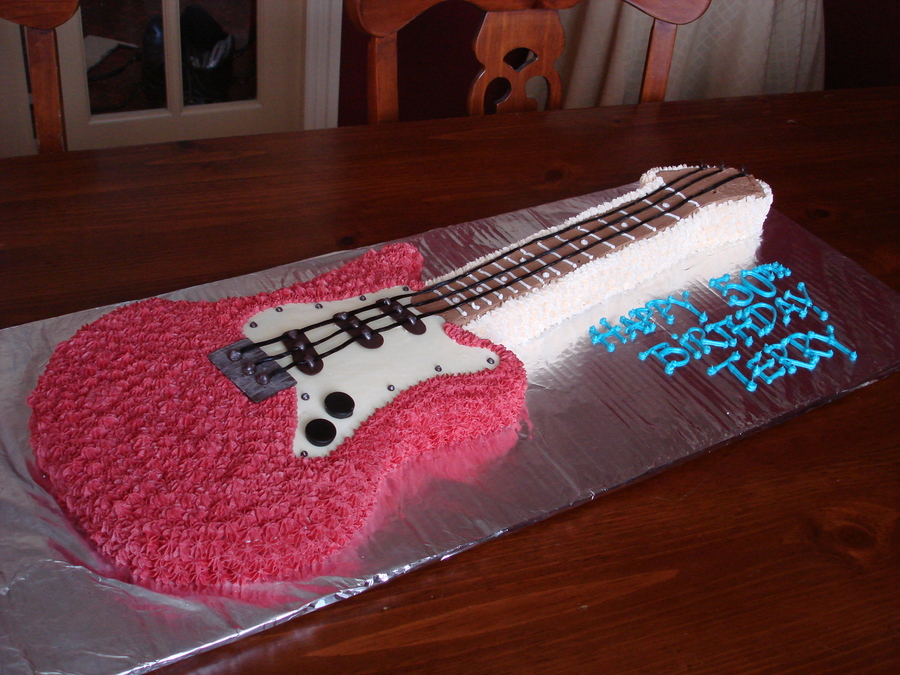Birthday cake made with 2 9 x 13 cake and cut into shape of guitar - iced and details made using some candies and gum paste and licorise for strings