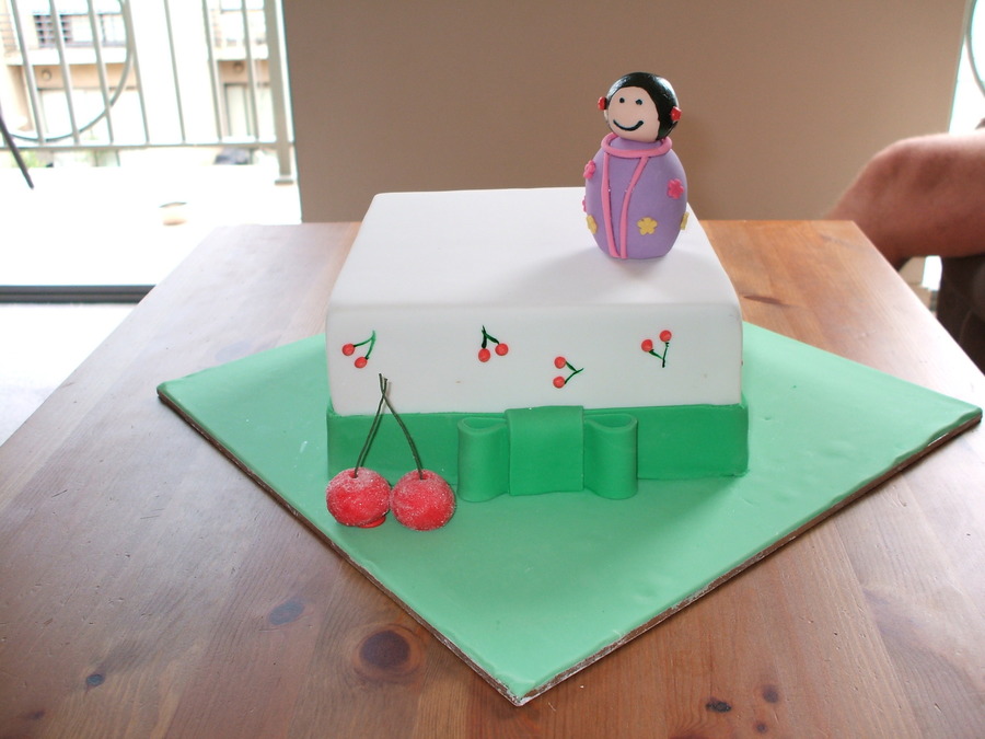 This is a Japanese cherry cake. Figurine on top made from fondant and cherry piped on the sides.