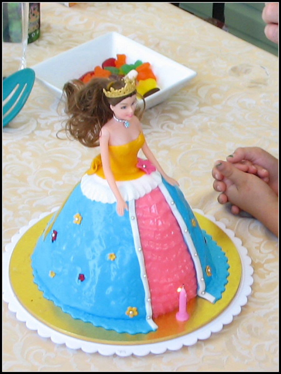 This is a barbie cake I made for my 2 year old daughter's birthday. It was a chocolate cake with butter cream filling, coverred with fondant. I baked the cake with a Dolly Varden Cake Tin, it shaped really nice.