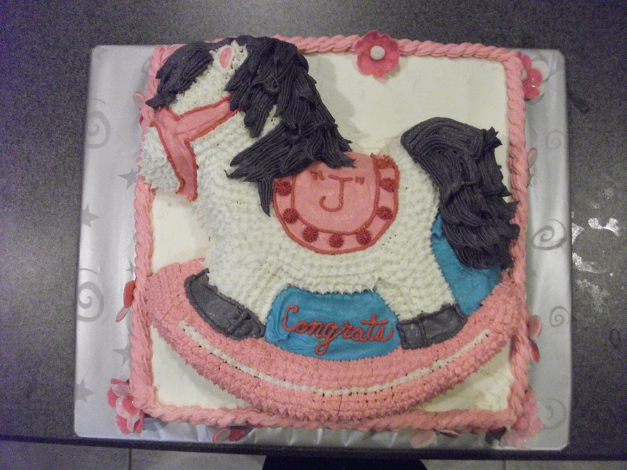 My boss was expecting a baby girl. Used the Wilton Rocking Horse mold and a 16" square cake for the base. Bottom is chocolate with white chocolate mousse filling and cream cheese frosting. Horse is strawberry with white chocolate cream cheese frosting.