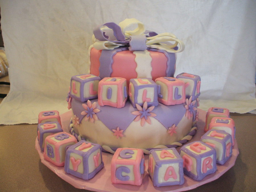 This was a cake for 2 of my friends who are due within a few weeks of each other. It is a Strawberry Mud Cake that was absolutely divine! Filled with a strawberry filling, and frosted with strawberry buttercream (tasted like ice cream!), then covered in fondant. The blocks are formed from my daughters alphabet blocks. I covered them with seran wrap and then put the fondant over them. Next time I make blocks like this I will use frosting as the outlines rather than rolling fondant. The bow could use some work, but it was my first.