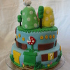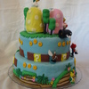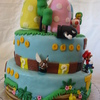 everything is fondant, except characters were purchased..."mushroom" hills are crispy treats covered with fondant...trees are wood dowels painted with brown gel paste with fondant foliage