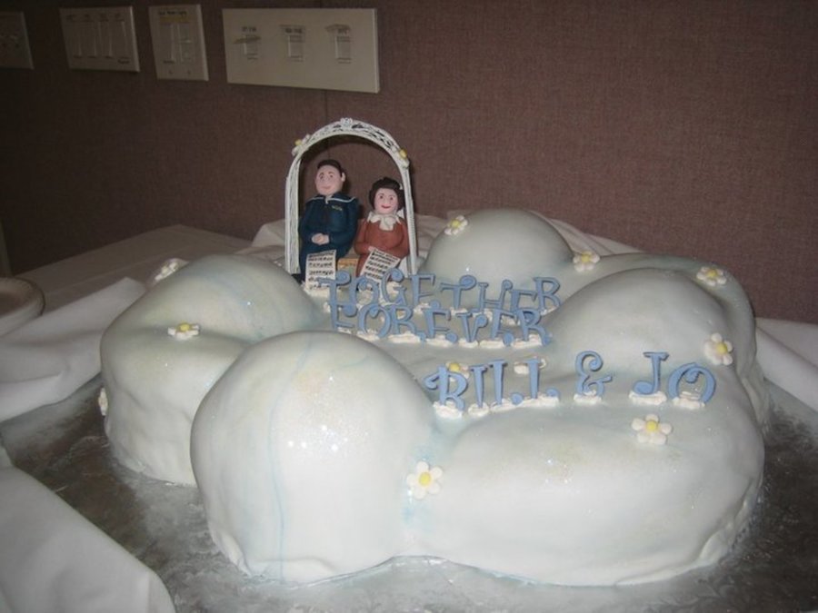 Depicts my beloved aunt and uncle in their wedding clothes from 50+ years ago. They passed away within 3 years of each other...my cousin did a double memorial, as my aunt never had a memorial/funeral for my uncle who passed away before she did. Cake was a cloud in heaven...a tribute to their love for each other. Figures are gumpaste...sitting on purchased miniature park bench and under purchased miniature garden arch...lettering is gumpaste, too, made with "funky alphabet" tappits...sheet music is gumpaste, too.