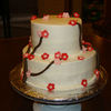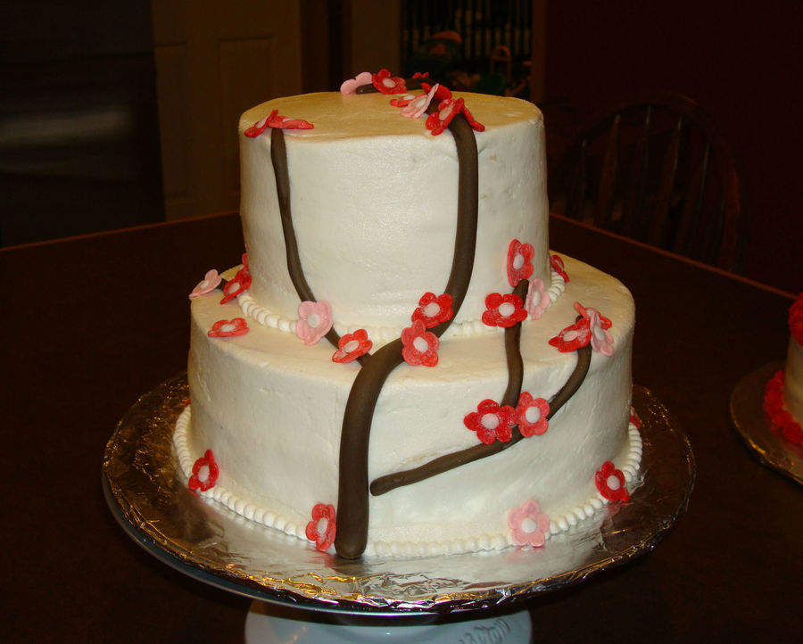My first attempt at Cherry Blossoms. Made for a valentine's dinner at our church. Chocoloate fudge cake on bottom tier, vanilla top tier, white chocolate buttercream.