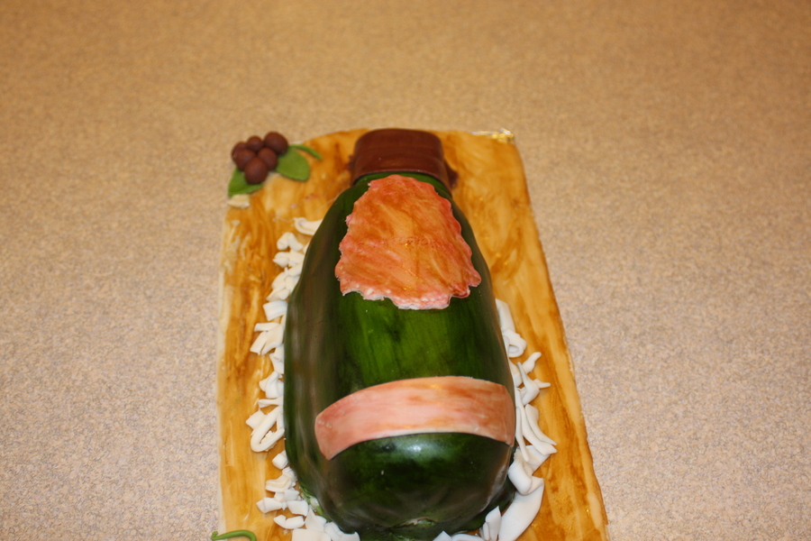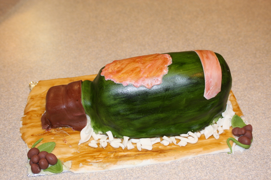 A peanut butter cake with banana frosting. This was covered with fondant and painted with vodka/gel food colouring. After covering it, I realized that I need to work on my shaping!