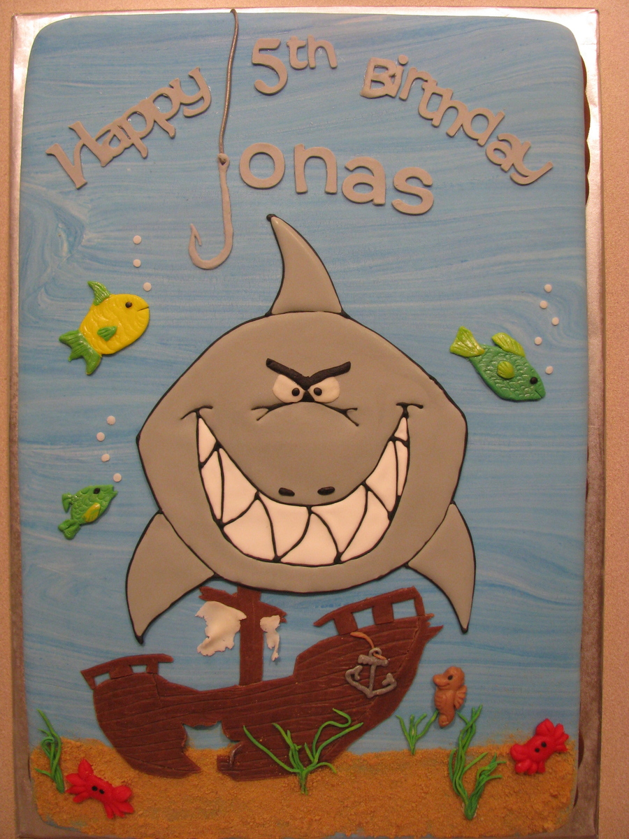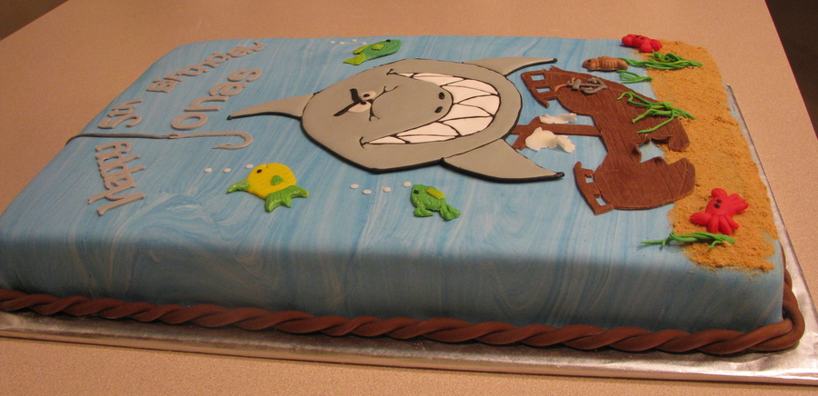 WASC, covered in marshmallow fondant. Shark is a royal icing image..everything else made from fondant. oh, and the sand was crackers.