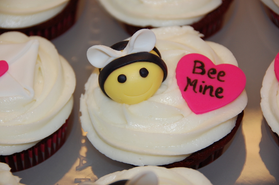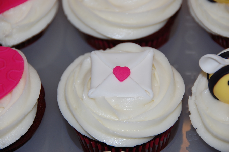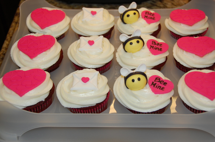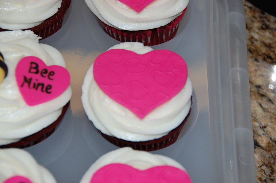 Red velvet cupcakes with cream cheese frosting and fondant accents. Thanks to all the CCers for the great ideas!
