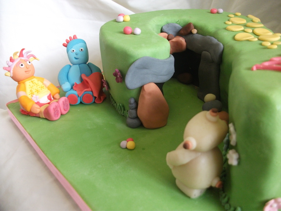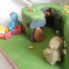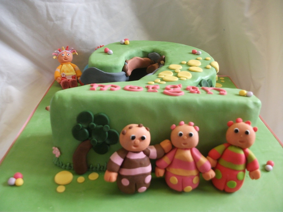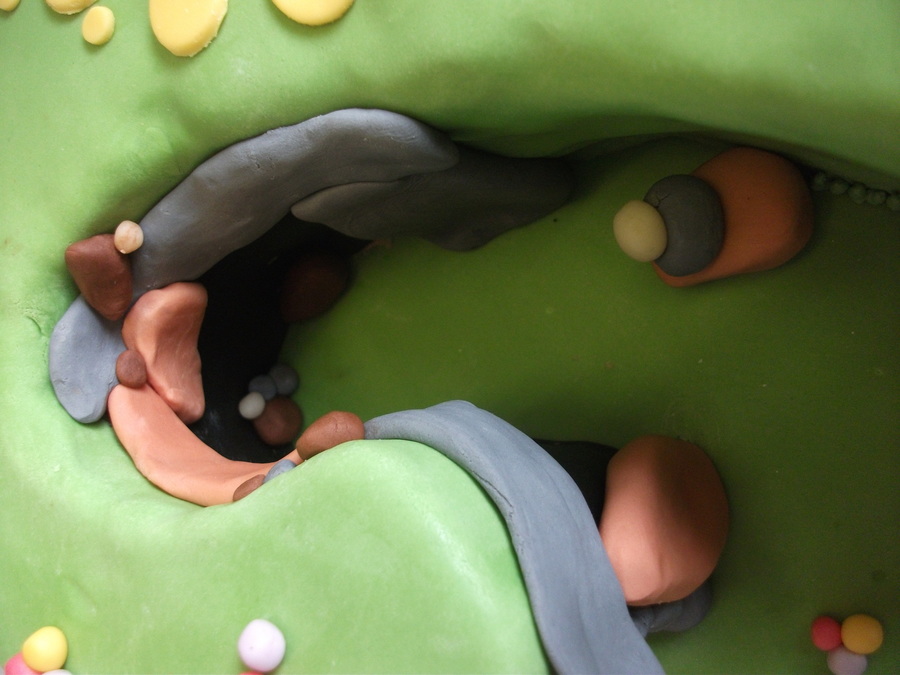 number 2 cake hand carved from a 10" square chocolate cake. filled with chocolate BC. covered in fondant. all figures etc are handmade from fondant and tylo. my first number cake. i had loads of problems trying to cover it with fondant so i ended up making makka pakkas cave inside the curve of the 2. but i think it looks better like that! TFL