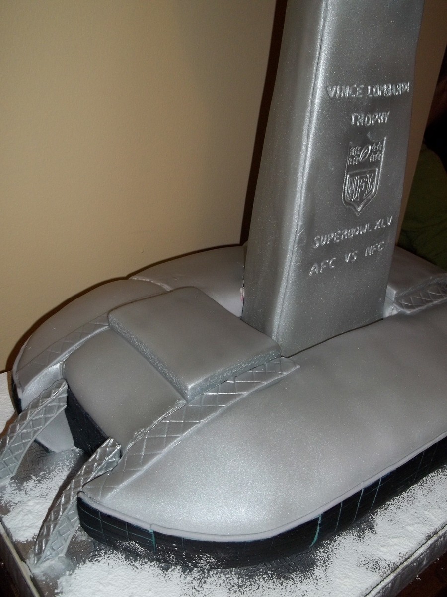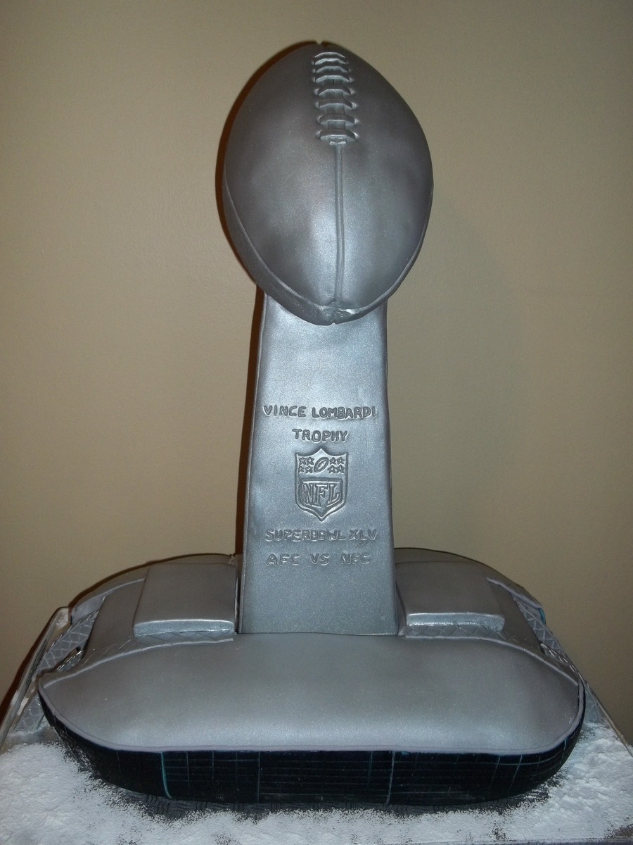 Vince Lombardi trophy & Dallas stadium Cake was made by my son, football fan. Vanilla cake +raspberry filling with rasberry sour puss liquor and cream cheese buttercream. I baked the cake and made MMF and filling . He did all the rest...the trophy isRK and stadium is cake.Very long process but it was fun. This is his 2nd cake , last year he made the football field.