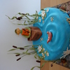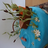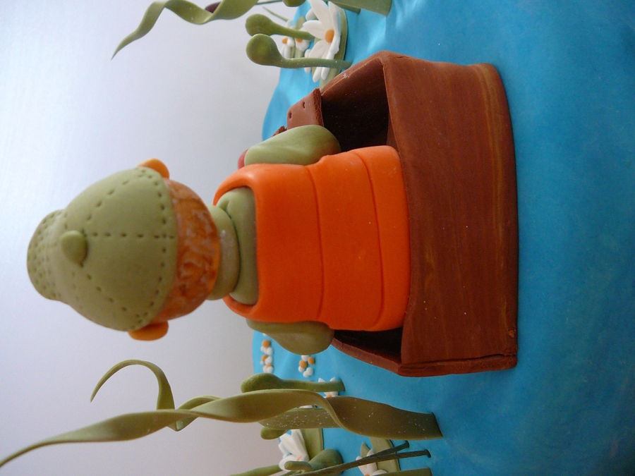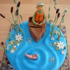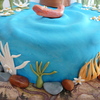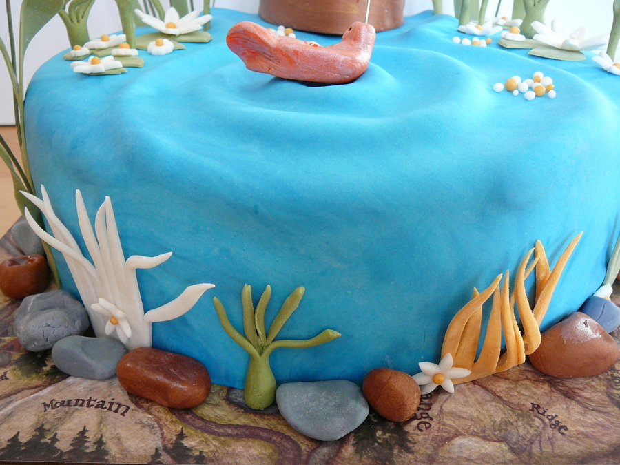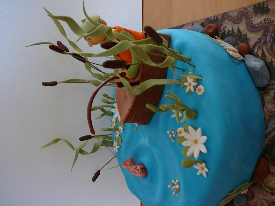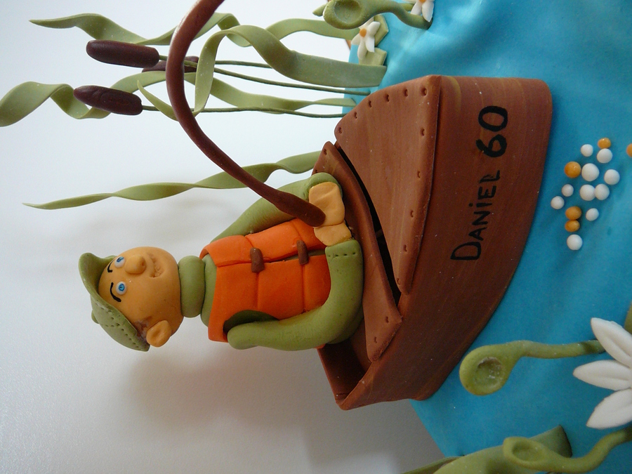This is a cake for my uncle Daniel who turns 60. Chocolate cake with custard and chocolate ganache all covered with fondant. All details (fisherman, launch, distaff, water lily, rock...) are fondant. All edible except for the fishing rod, there is a broach inside. It was very fun to make this cake!
