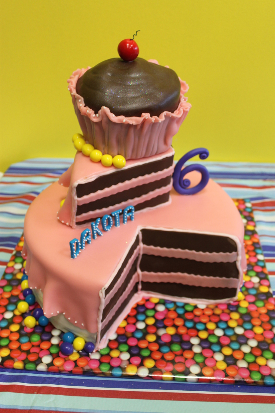 dark chocolate and rainbow vanilla bean cake with vanilla bean buttercream filling, covered in MMF...