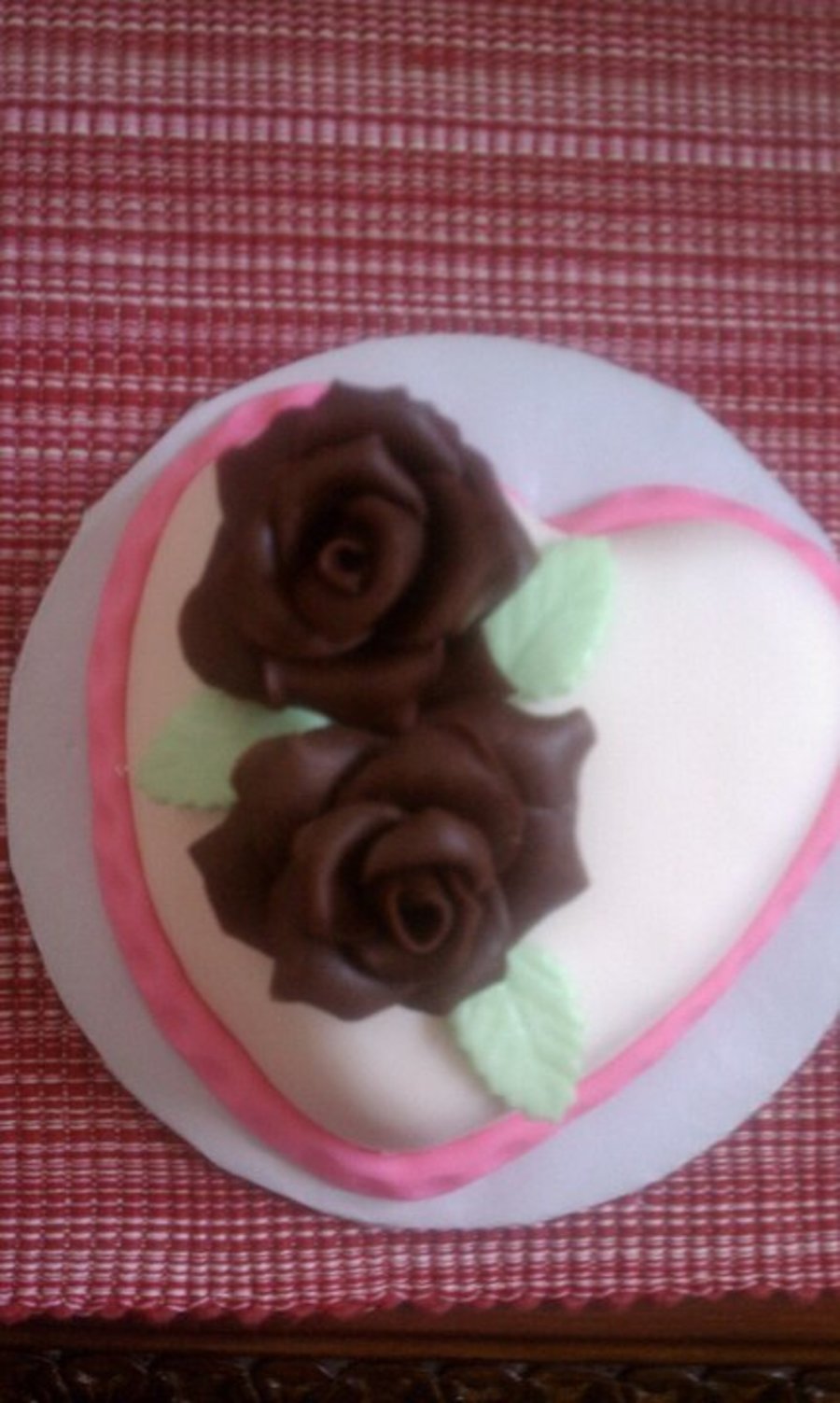 4" strawberry cake with chocolate roses and fondant accents