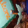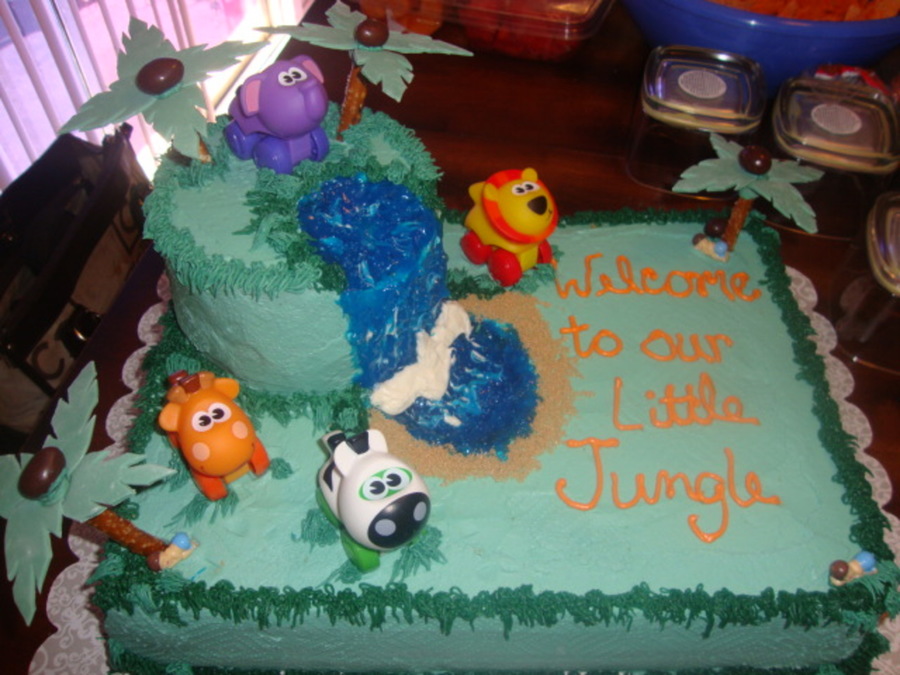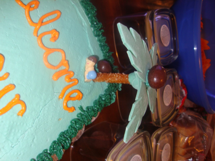 my niece at this time didnt have a name and her theme was baby jungle. it is basic white thats what she wanted.I made the tree's from prezels and gum paste.and the coconuts from m&ms.