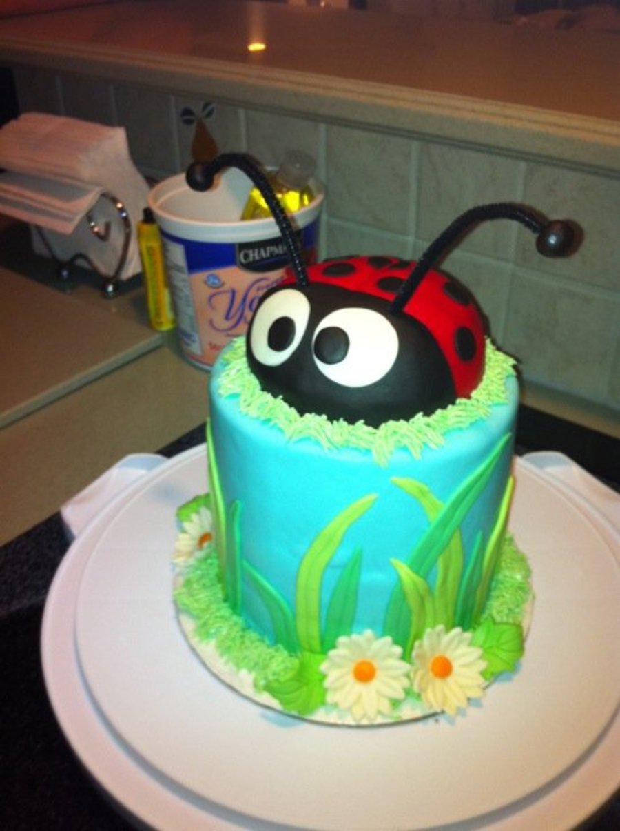 I just started making cakes and my sister is my "tester." This was for her birthday. The ladybug is made with ricecrispy treats. Thanks for looking!