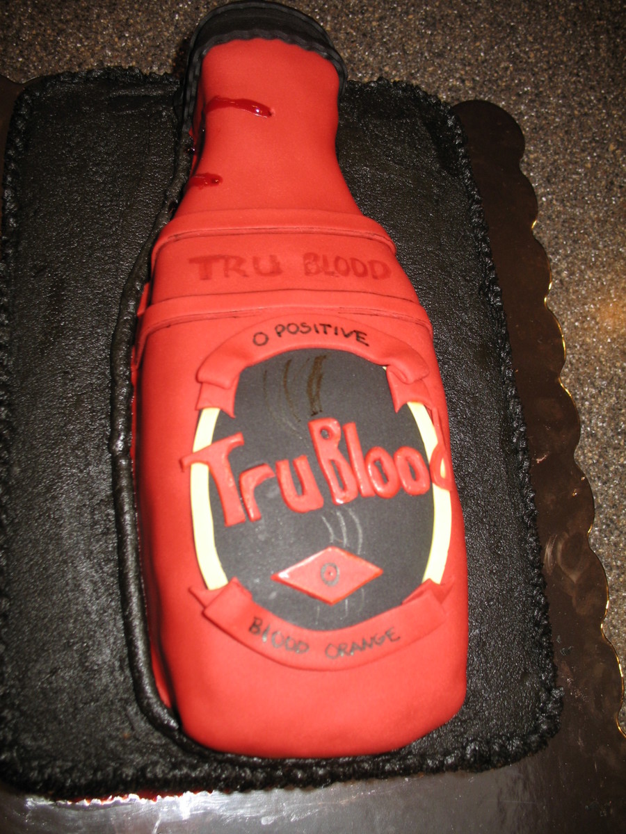 Cake bottle is cake covered with fondant. My first time covering with fondant. Bottle turned out a little crooked somehow? Black chocolate buttercream icing. And of course the blood!!