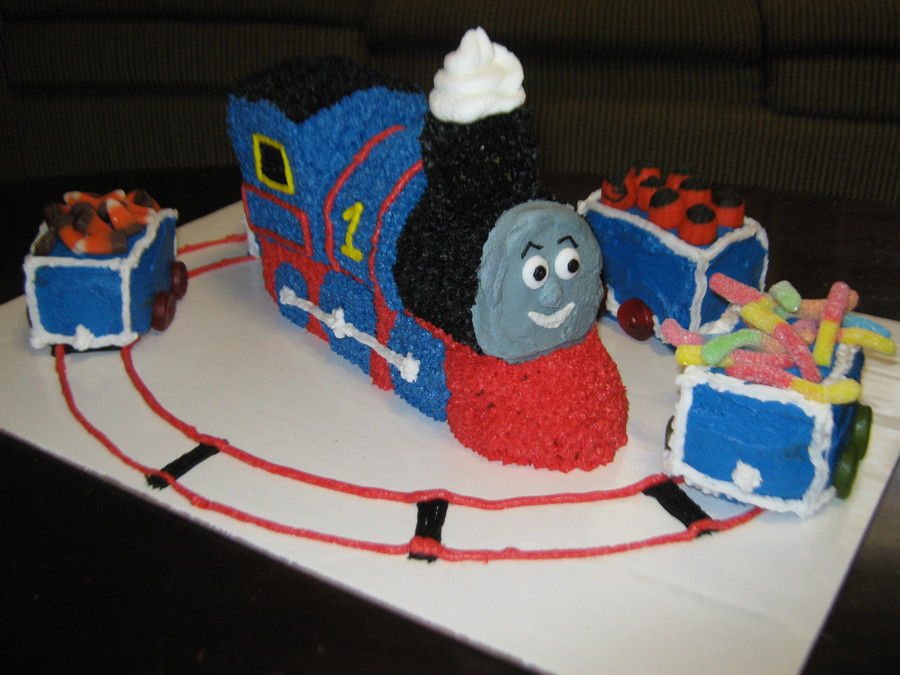 Found a great train 3-D cake pan and then decorated it like Thomas the Train. Included doubled up mini loafs to make the train cars which I filled with different candies. Piped train tracks around the main train to "set" the cars on.