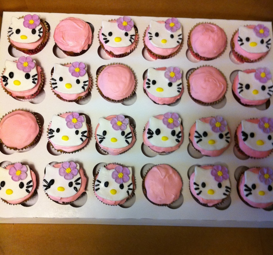 Cupcakes with chocolate filling. Kitty's faces are made of fondant.