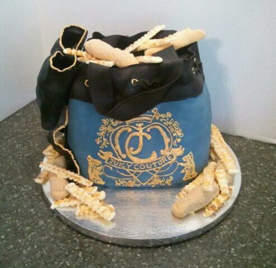 Juicy Couture purse, hnd piped logo, The custmer loved Chicken tenders and fries so we incorporated that too... all fondant.