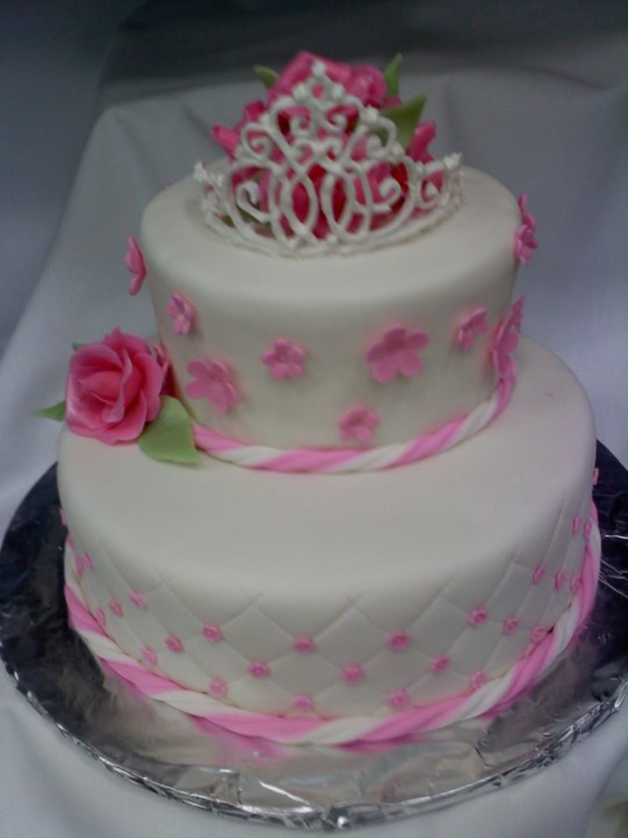 So pleased with how this turned out!! its vanilla liquid shortening sponge cake(i think i'll do pound next time). 4 layers top and bottom. then swiss buttercream. and covered in fondant. the tiara is royal icing( i made 4 and two broke last night and one this morning. ironically the one that made it on the cake was the first one i made. o.O). roses are made of marzipan, and little flowers on the sides are gumpaste. i got a 94%!