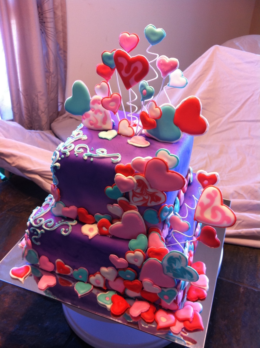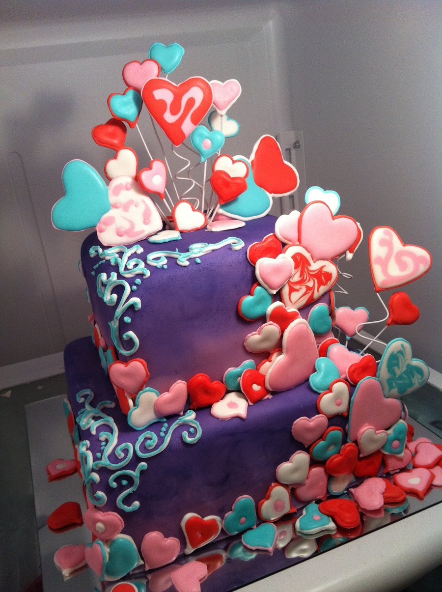 This is a vanilla cake and a strawberry cake layered alternately with cream cheese w/ fresh strawberries filling. Covered in fondant and decorated with royal icing hearts and royal icing scrolls.