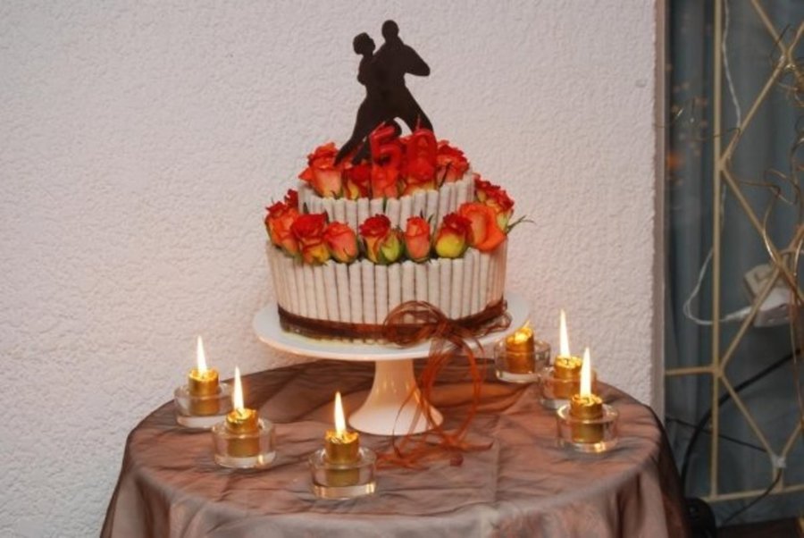 This is covered with chocolate waffers and a Tango couple sillohette on the top made from gum paste with fresh roses