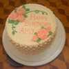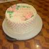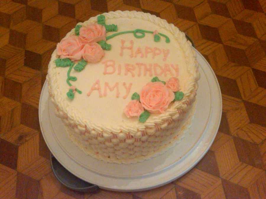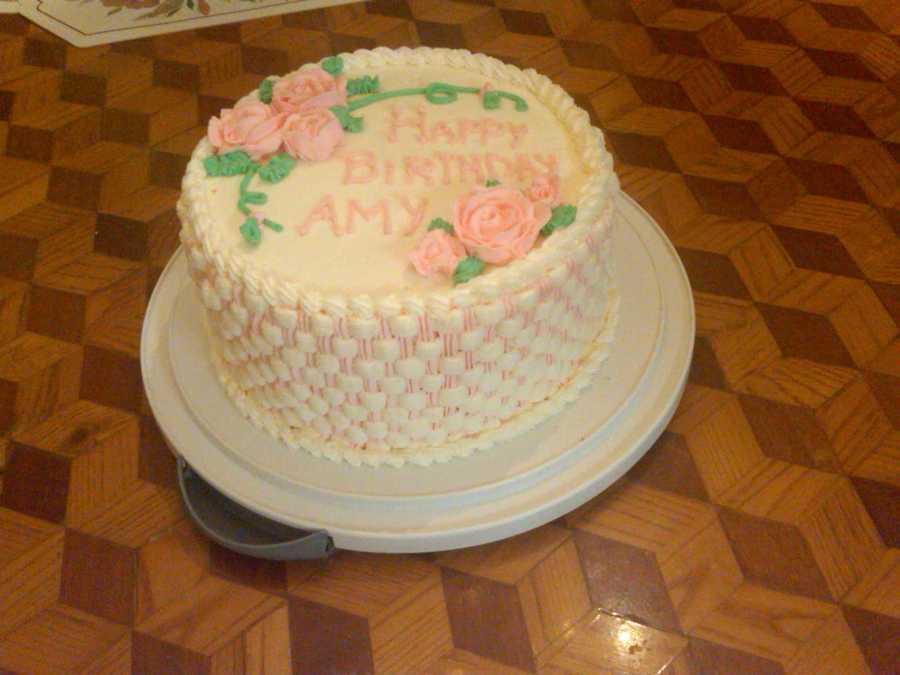 Yellow cake with buttercream frosting. Decorated using basket-weave with two colors and roses.