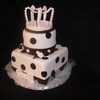 I matched the cake to the invitation which had brown and pink polka dots and a full crown on it. Crown is gumpaste, cake is fondant. Top tier is strawberry cake with lemon curd/lemon bc filling, bottom tier is strawberry cake with strawberry cc filling. Fondant dots, bow, flowers, leaves and bands, pink tulle fabric used on cake board.
