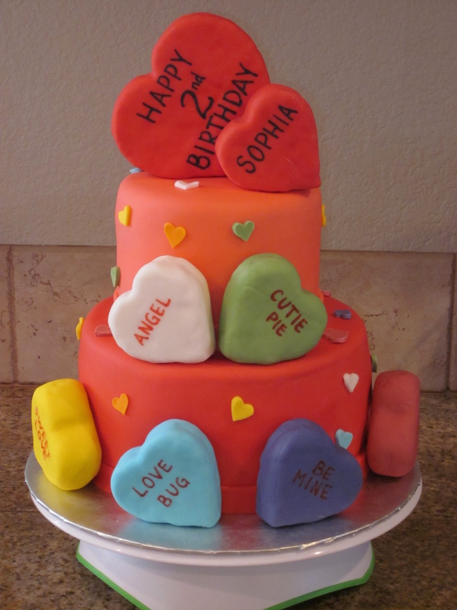 Conversation Hearts are made of rice krispie treats with fondant covering.