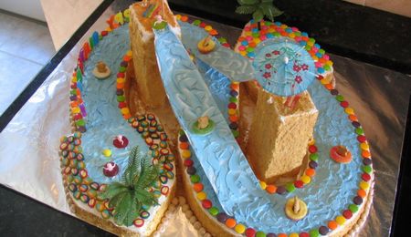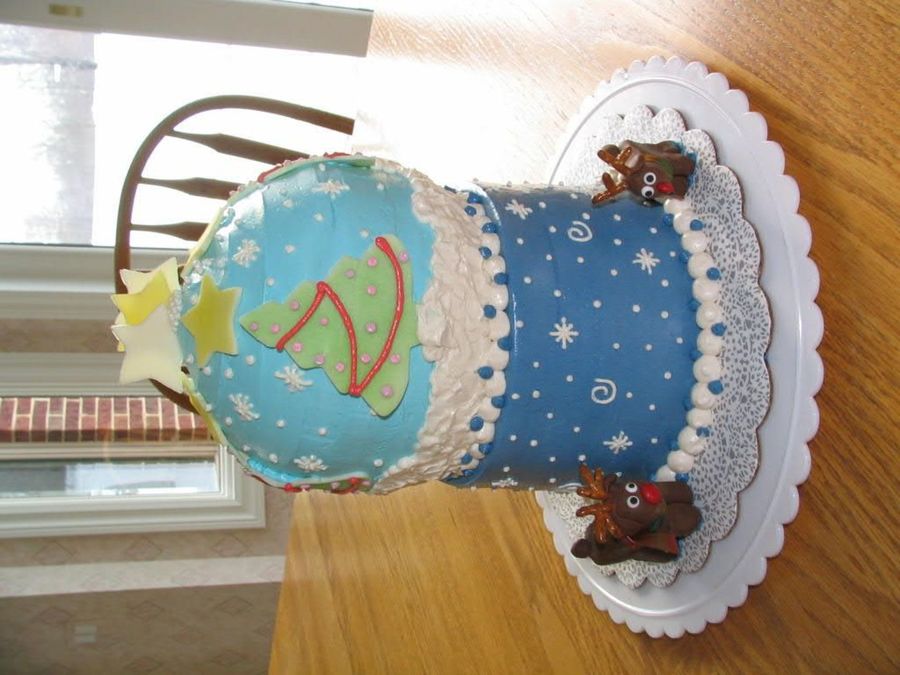This was my second cake from hell. I was so inspired when i saw boween's snowglobe cake that i wanted to try it for a family get together. I did not support it enough i guess because overnight it became the leaning tower of Pisa. I had to take the globe apart and take it to the party seperated. I was so disappointed!, but i did learn my lesson on supporting. The stars, trees and reindeer were made from chocolate clay.