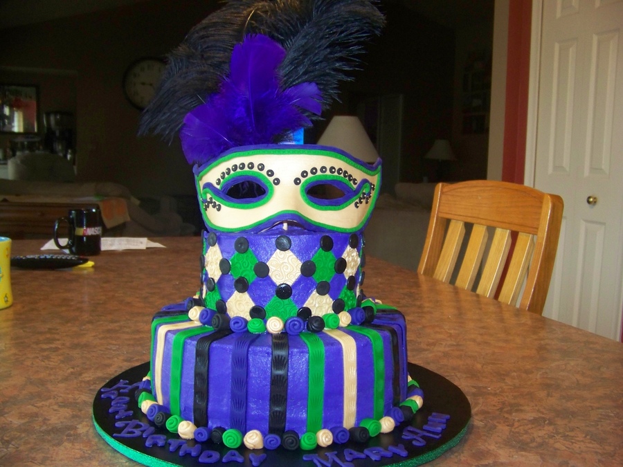 Mask is made out of fondant and of course the feather is real. I love the colors the client picked out, reminds me of Mardi Gras.