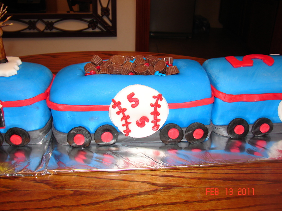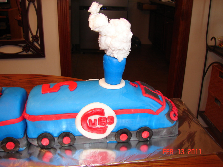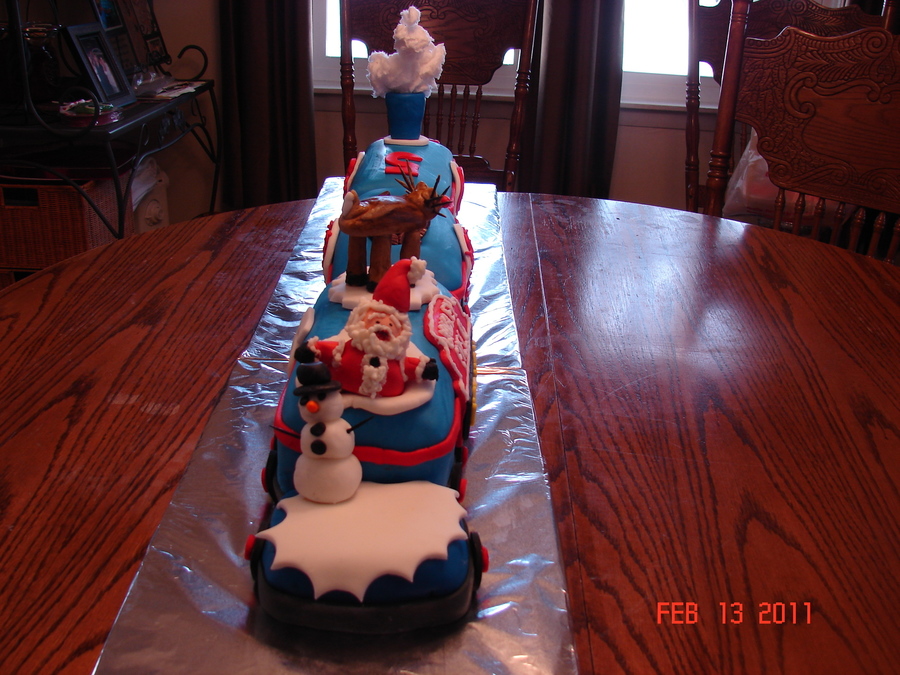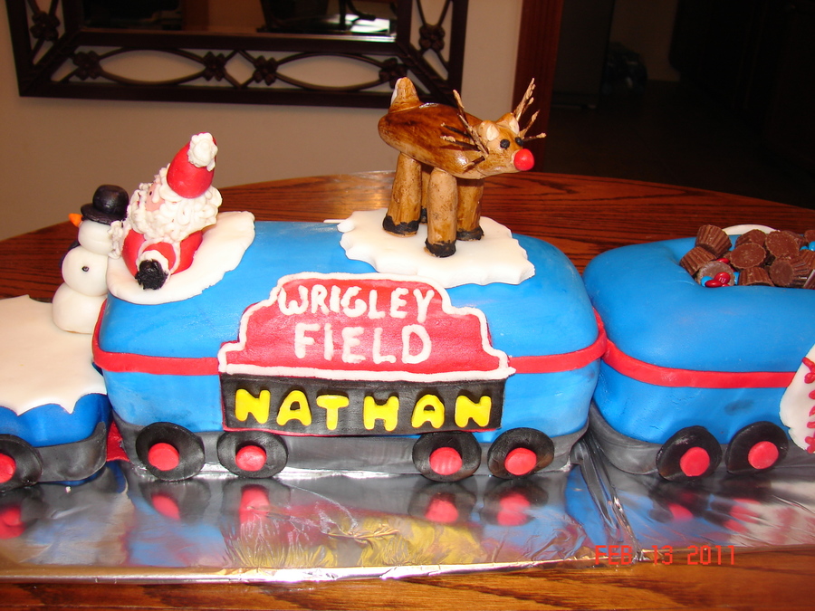 I made this cake for my nephew's 5th birthday, who loves the Chicago Cubs, trains, and Christmas. He insisted that I put a Santa, snowman, and (my lame attempt of) a reindeer on it. He absolutely loved it. I used 2 large Wilton's loaf pans, cut them to form three train cars and extra small car for his candle.