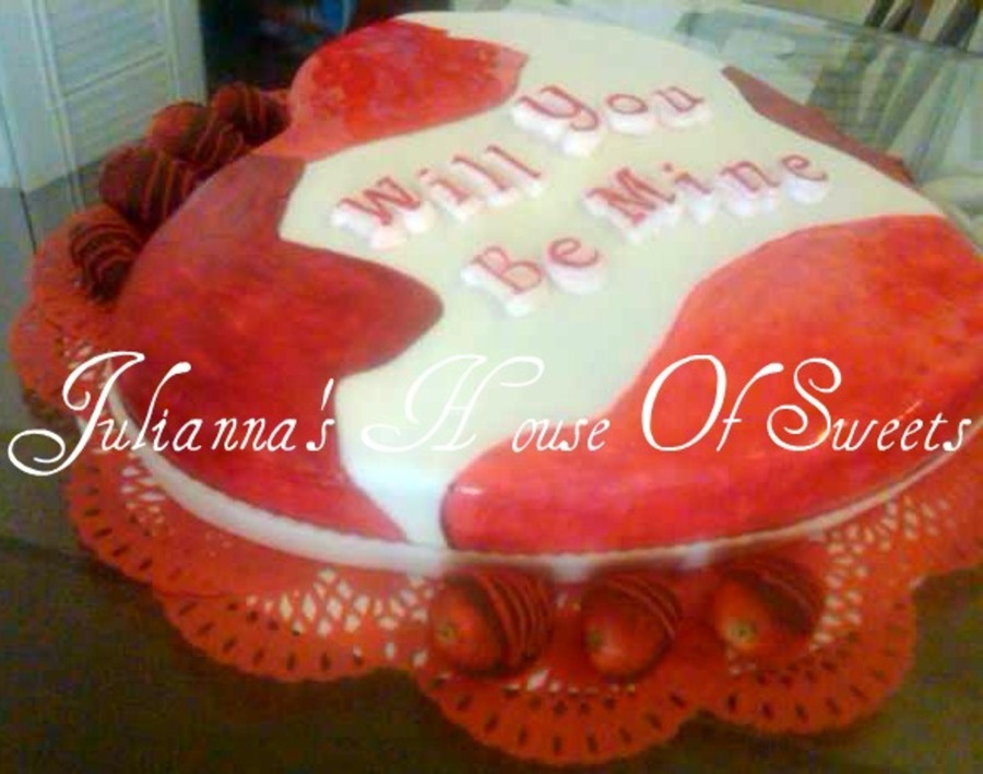 This is a 16in Heart cake red velvet,cream cheese filling,fundent covered,hand painted and chocolate cover stawberrys..