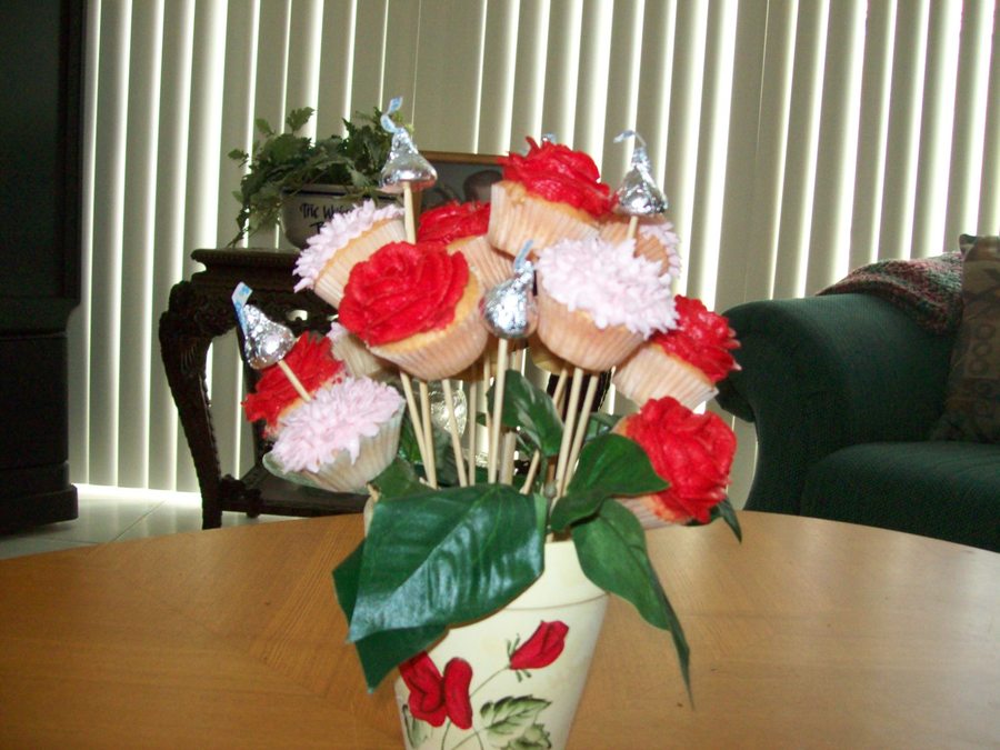 This is my first try at flower pot cupcakes....Next time, I'll make the sticks shorter, or cover with green frosting...(I'm not liking those sticks)...Cherry chip mini cup cakes with buttercreme frosting flowers...I used shishkabob scewers and a bit of styrofoam in the flower pot. Any sugestions would be welcomed! Thanks for looking!