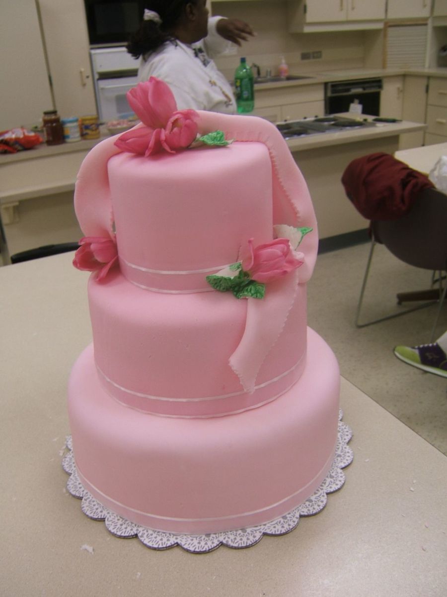 This is the first wedding cake that I did in class. I'd love to get some honest opinions. One day I hope to own my own business. I used fondant and real flowers.