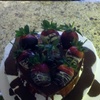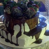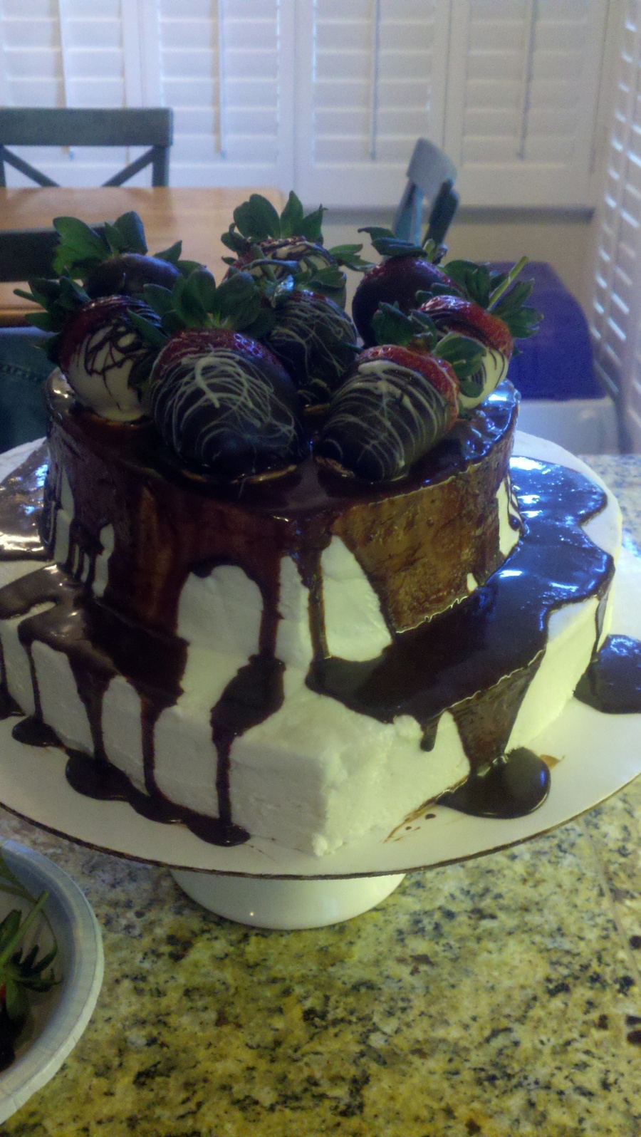 Chocolate sour cream cake with strawberry filling. Buttercream with Ganache and chocolate covered strawberries. Made this for the boys in the house. Yeah they drooled !!!! Can anyone tell me why my Ganache came out thin????