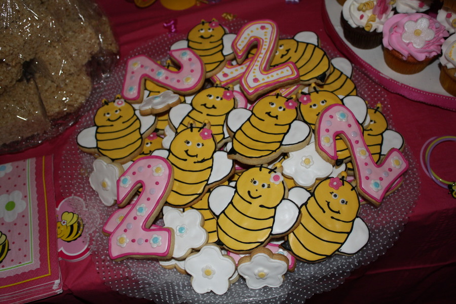 I made these cookies to go along with a cupcake tower....birthday party theme was 'sweet as can bee'. I couldn't find a bee cookie cutter that didn't look like a dragonfly, so I actually hand cut these using a picture I printed online. I also hand cut the #2's because I ordered a cookie cutter and when it came in I didn't like it! The mini flowers were from a cutter. I love how these cookies turned out!
