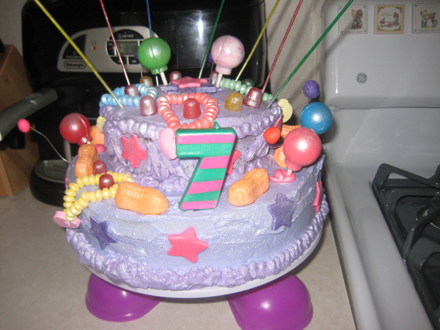 Vanilla cake with dulce leche mousse surrounded by all types of candy.