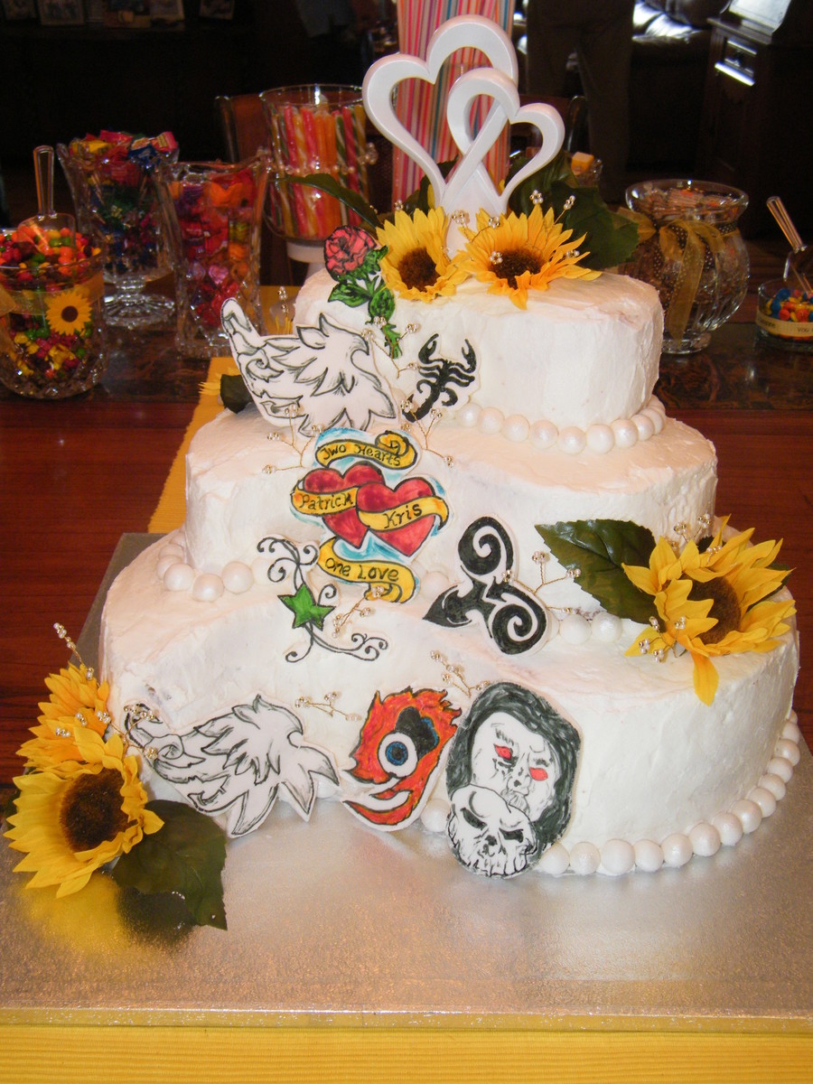 I did this cake for my best friend. It's a vanilla buttercream with fondant cut-outs of tattoos that she and her fiance have.